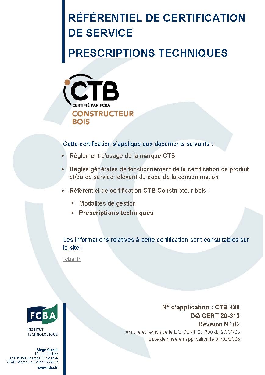 CTB Constructeur Bois est une marque collective de certification de service conforme à l’ISO 17065, qui s’applique au processus de conception, de fabrication et de mise en œuvre des constructions en bois.